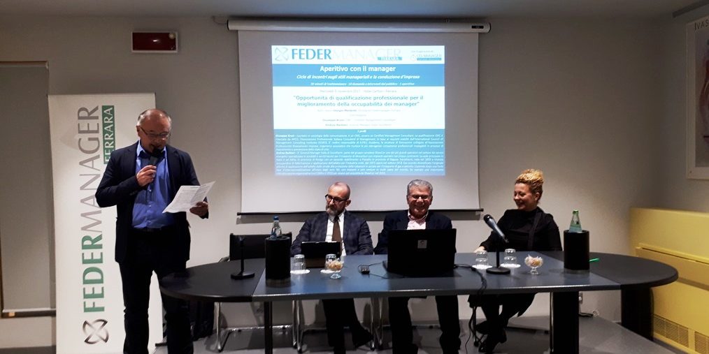 Mercoledì 8 novembre Federmanager Ferrara ha promosso un’occasione di confronto sul tema “Opportunità di qualificazione professionale per il miglioramento della occupabilità dei manager”, primo appuntamento della stagione di “Aperitivo con il manager”, ciclo di incontri dedicati agli stili manageriali e alla conduzione d’impresa che si svolgono presso l’Hotel Carlton in piazza Sacrati a Ferrara, dalle 18 alle 20.