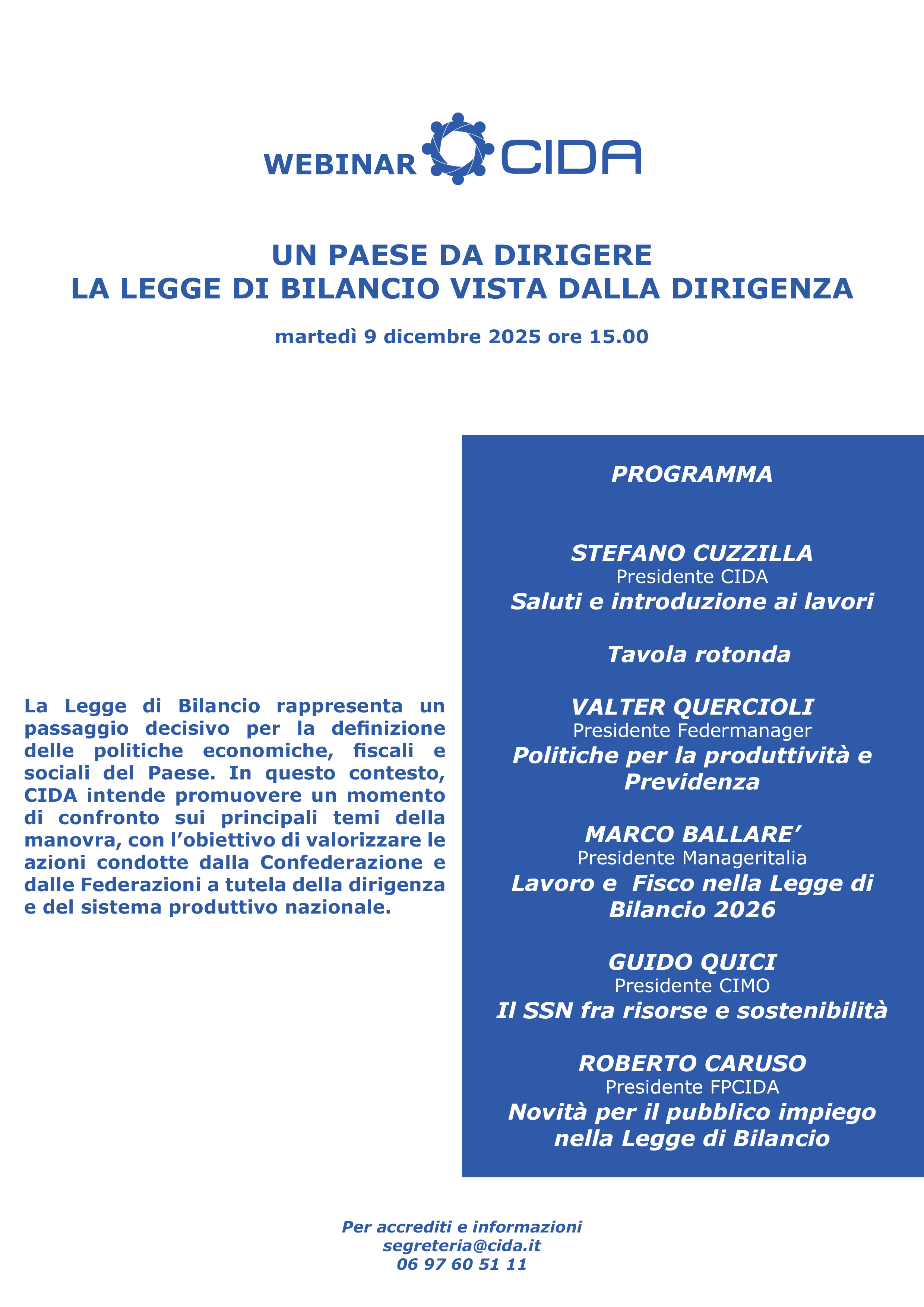 • Webinar CIDA “Un Paese da dirigere: la Legge di Bilancio vista dalla dirigenza”, Martedì 9 dicembre, dalle ore 15.00 alle ore 16.00, su piattaforma zoom – Scarica la locandina – iscriviti: segreteria@cida.it entro le ore 13.00 di venerdì 5 dicembre.