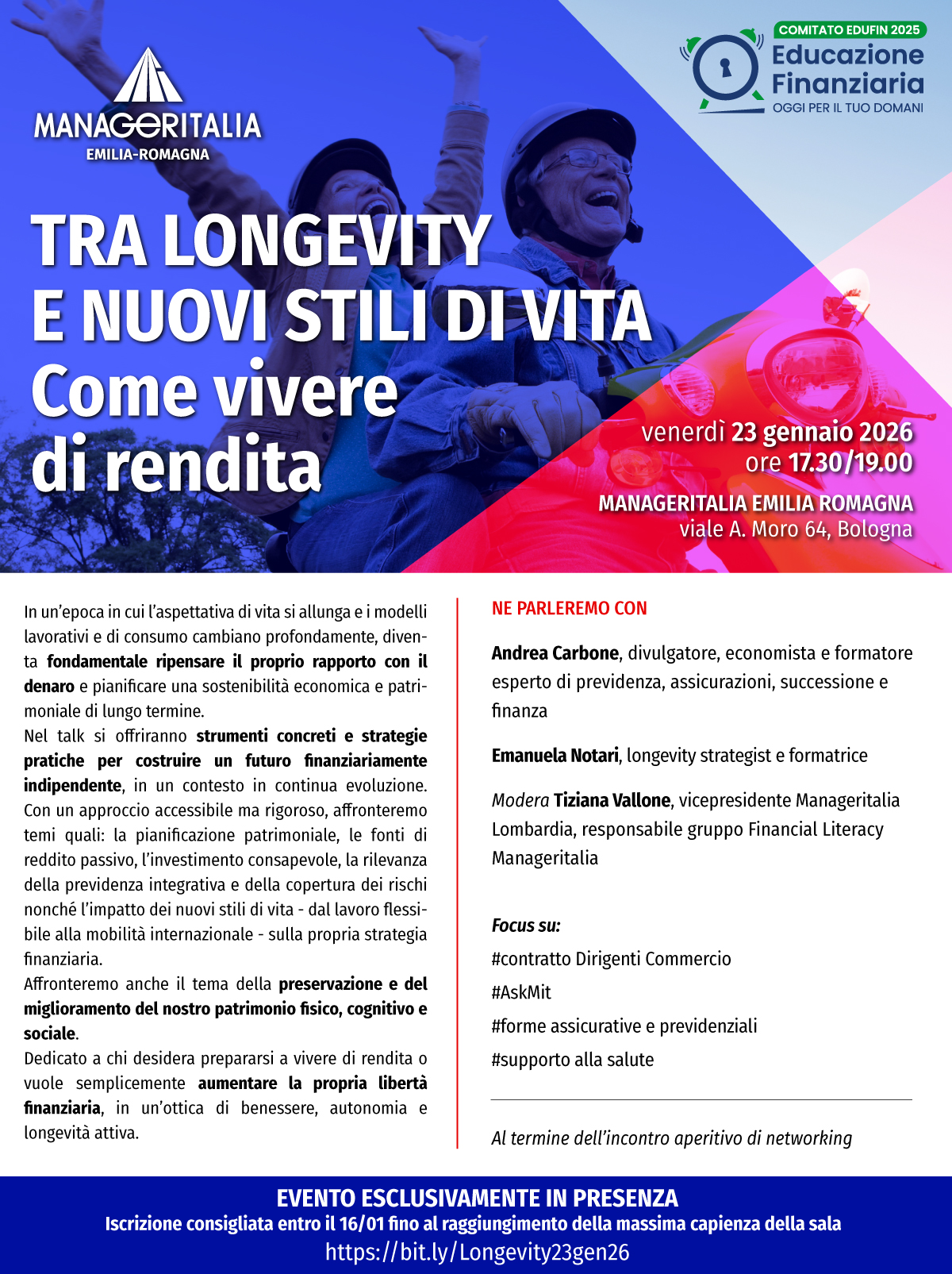 - Tra longevity e nuovi stili di vita: come vivere di rendita – 23 gennaio 2026 dalle 17.30 alle 19.00 presso Manageritalia Emilia Romagna, Via A. Moro 64 (BO) – scarica la locandina – iscriviti